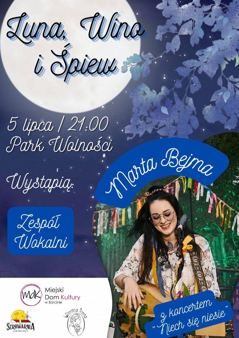 Miejski Dom Kultury w Barcinie serdecznie zaprasza dnia 5 lipca o godzinie 21.00 do Parku Wolności w Barcinie na koncert wieczorny pt. „Luna, wino i śpiew”.