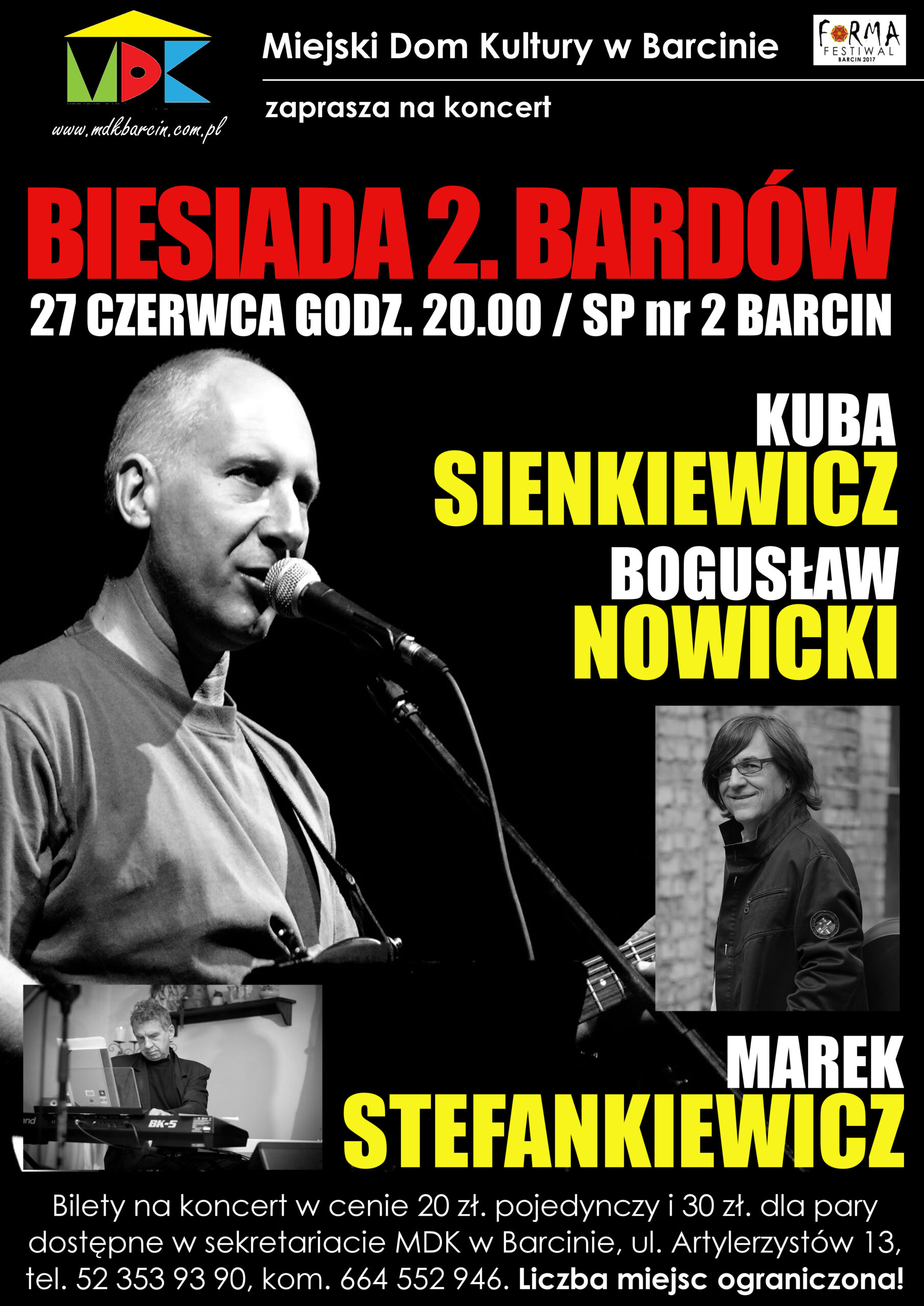 Miejski Dom Kultury zaprasza na koncert BIESIADA 2. BARDÓW w wykonaniu Kuby Sienkiewicza, Bogusława Nowickiego i Marka Stefankiewicza, który odbędzie się we wtorek 27 czerwca o godz. 20.00 w Szkole Podstawowej nr 2 w Barcinie, w ramach 8. Ogólnopolskiego Festiwalu Piosenki z Tekstem FORMA.