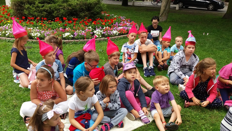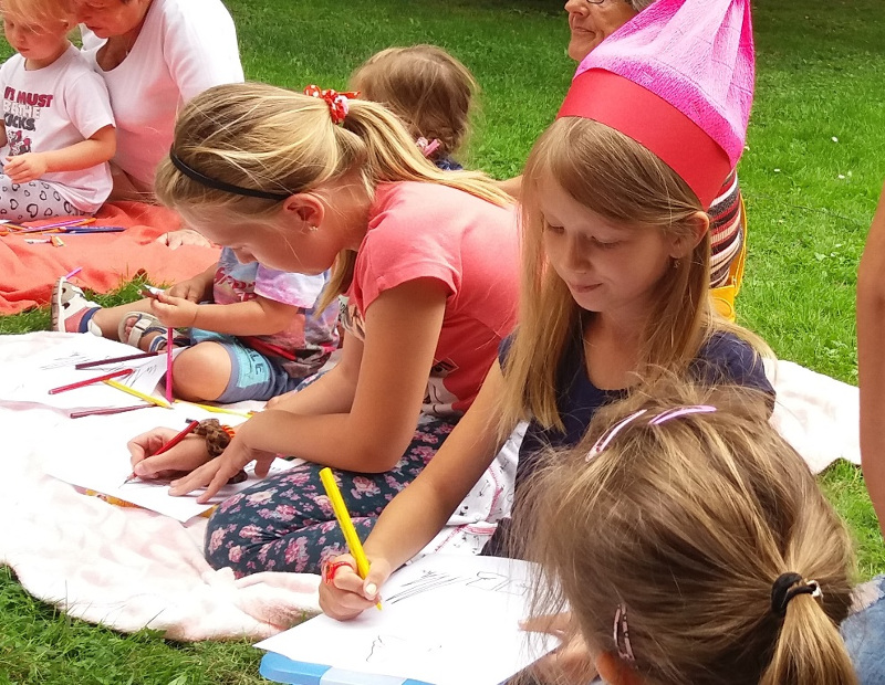 Spotkanie odbyło się w plenerze na polanie przed biblioteką. Dzieci wysłuchały bajki, dokończyły rysunek przedstawiający krasnala, szukały drogi do domku krasnoludków, śpiewały piosenkę o krasnoludkach, odpowiadały na pytania dotyczące tekstu bajki, a także szukały krasnali i Śnieżki ukrytych na łabiszyńskiej wyspie. Bawiły się przy tym wyśmienicie. Na koniec w nagrodę za wykonane zadania otrzymały lody. Spotkanie odbyło się w ramach Ogólnopolskiego Pleneru Artystycznego.