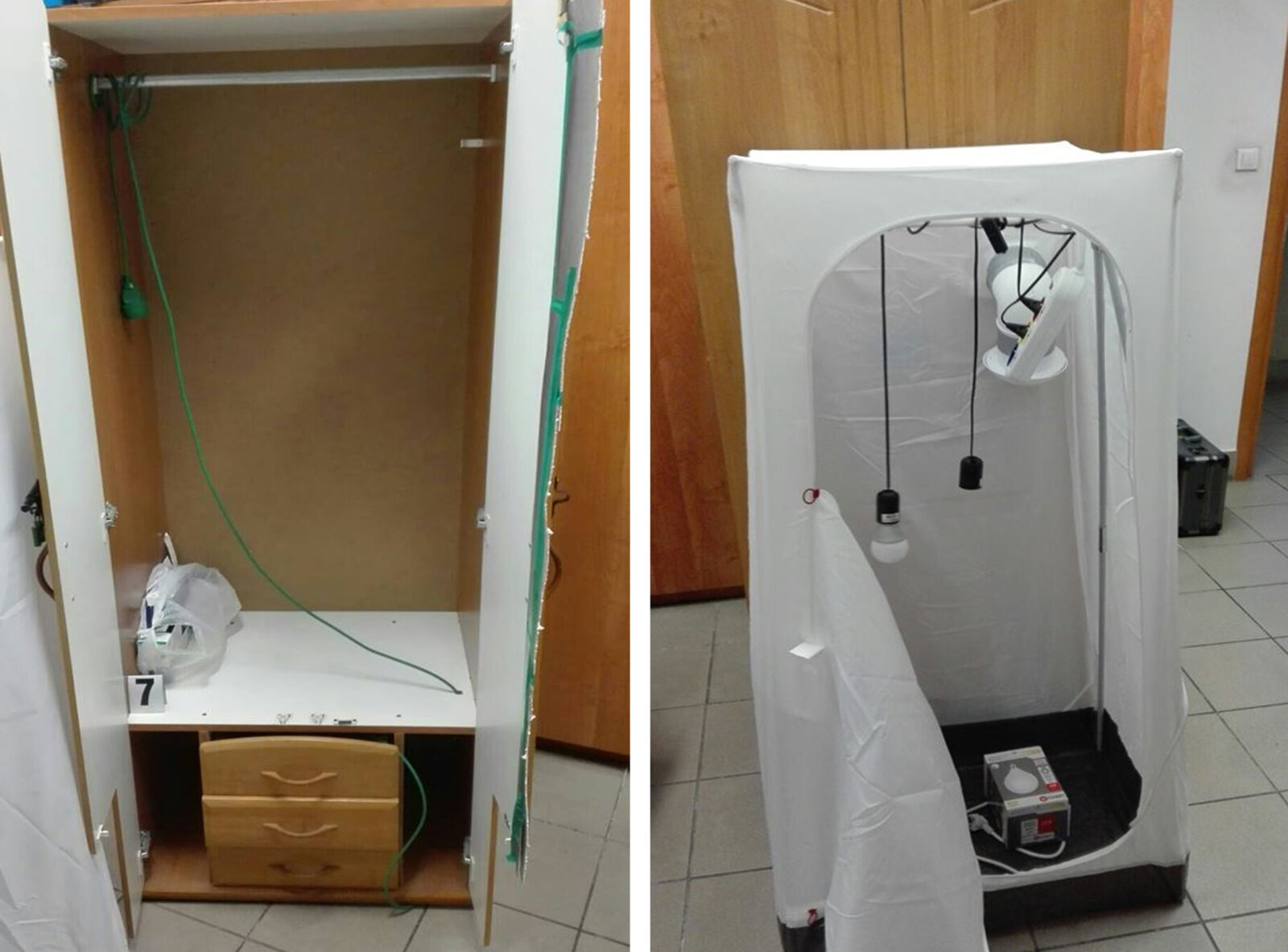 {jb_right45} Na strychu ujawnili metalowy stelaż pokryty białym materiałem z przedłużaczem, który był podłączony oraz lampami i wentylacją. W garażu natomiast znajdowała się drewniana szafa wraz z przedłużaczem i żarówkami. Dodatkowo za płotem na sąsiedniej nieużytkowanej działce policjanci znaleźli słoik, w którym znajdował się woreczek strunowy z suszem roślinnym, bibułki, młynek oraz woreczki z zapięciem strunowym. Powyższe przedmioty zostały zabezpieczone i posłużą jako dowody w prowadzonym postępowaniu.
