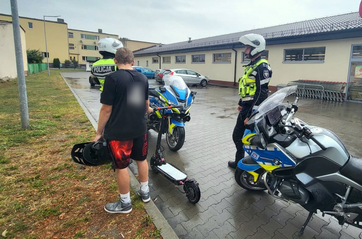 Funkcjonariusze wydziału ruchu drogowego żnińskiej komendy, podczas patrolu motocyklowego ulicami Janowca Wielkopolskiego, zauważyli użytkownika hulajnogi elektrycznej, który poruszał się po jezdni. Dozwolona prędkość w tym miejscu wynosiła 50 km/h. Zgodnie z obowiązującymi przepisami, w takich warunkach osoba kierująca hulajnogą elektryczną ma obowiązek korzystania z chodnika lub drogi dla pieszych. Dlatego zatrzymali go do kontroli drogowej. Był to 15-letni mieszkaniec gminy Janowiec Wielkopolski.