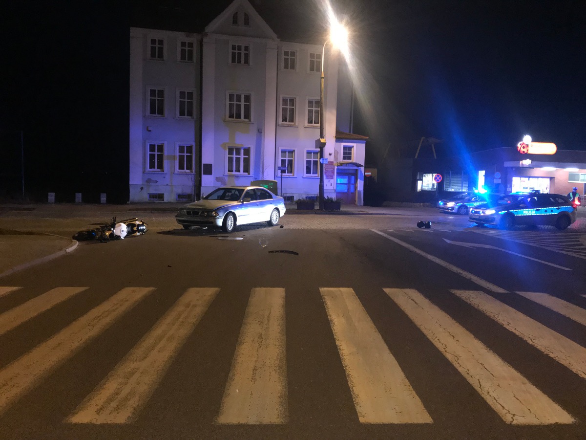 W poniedziałek, 21 stycznia br. około godz. 19.40 dyżurny żnińskiej komendy został powiadomiony o wypadku drogowym, do którego doszło na ul. 700-lecia w Żninie. Jak wynika ze wstępnych ustaleń funkcjonariuszy pracujących na miejscu zdarzenia, kierowca bmw, 27-letni mieszkaniec gminy Gąsawa, poruszający się w kierunku ronda, skręcił w ul. Potockiego, nieudzielając pierwszeństwa przejazdu motocykliście jadącemu w kierunku centrum i doprowadził do zderzenia czołowego.