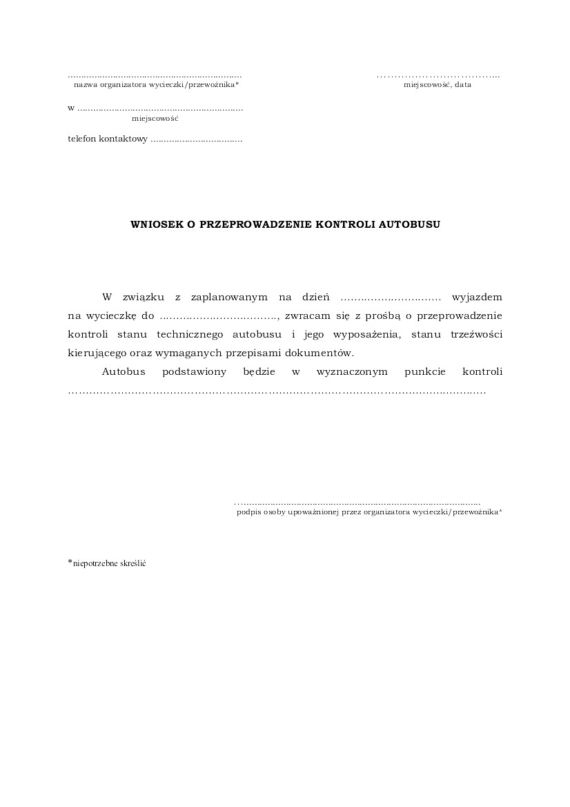 Poniżej zamieszczamy druk wniosku o przeprowadzenie kontroli autokaru. Wystarczy wpisać kilka podstawowych informacji i przesłać lub dostarczyć do KPP Żnin.