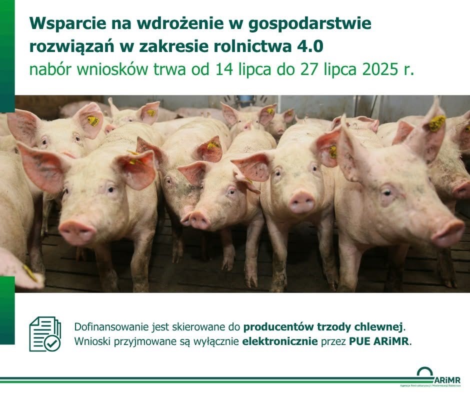 Od 14 lipca do 27 lipca 2025 r. producenci trzody chlewnej mogą ubiegać się o wsparcie na wdrożenie w gospodarstwach rozwiązań w zakresie rolnictwa 4.0. Środki pochodzące z Krajowego Planu Odbudowy i Zwiększania Odporności można przeznaczać na inwestycje w cyfryzację i automatyzację prowadzonej produkcji.