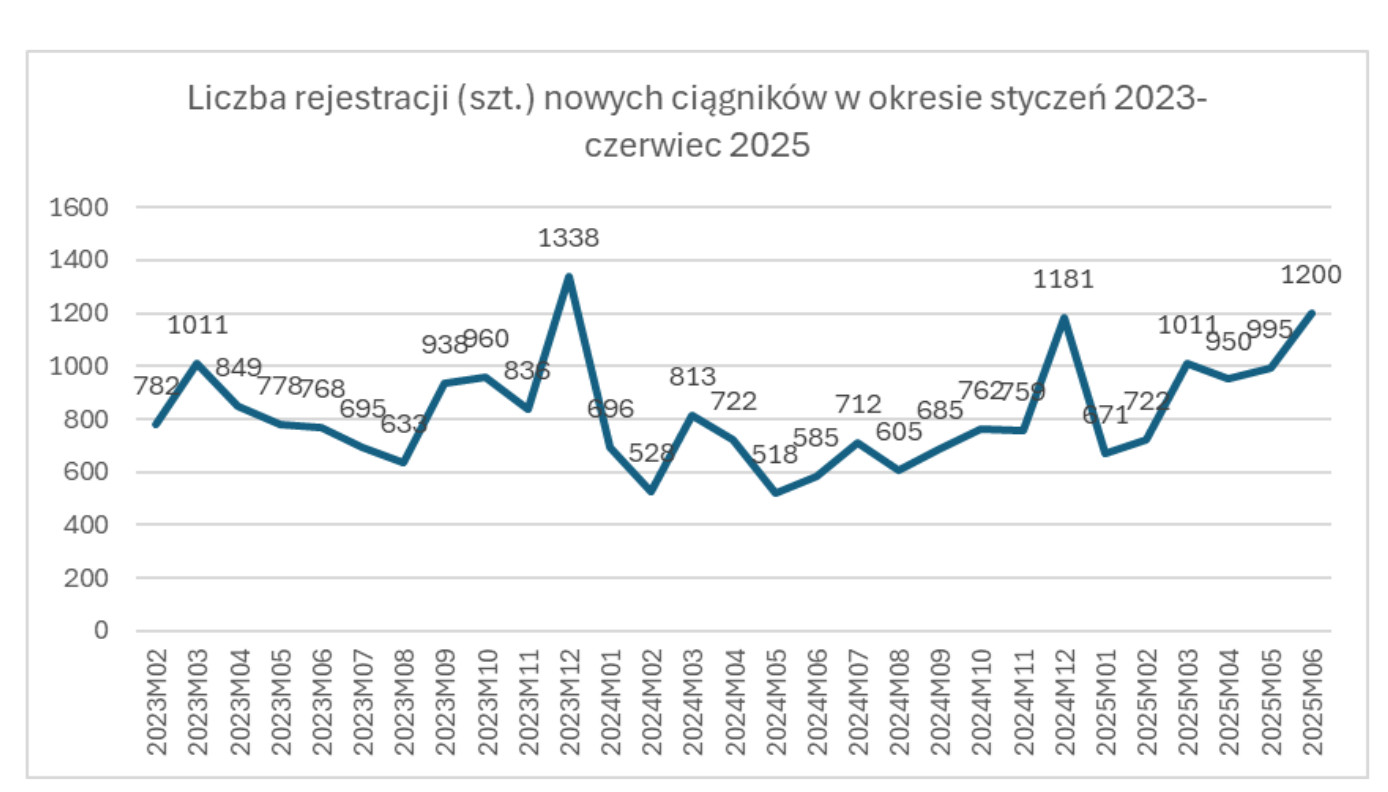 W czerwcu 2025 roku zarejestrowano 1200 szt. nowych ciągników rolniczych. To wynik powyżej średniej z ostatnich 12 miesięcy która wynosi 854 szt. Ilość zarejestrowanych nowych ciągników w czerwcu 2025 roku jest najlepszym wynikiem w tym roku. Jeżeli porównamy ilość zarejestrowanych ciągników w czerwcu 2025 roku z tymi z czerwca 2024 roku to mamy wzrost na poziomie 105% (615 więcej szt.) zarejestrowanych ciągników. W ostatnich 12 miesiącach (07.2024- 06.2025) zarejestrowano 10253 szt. ciągników a w analogicznym okresie roku poprzedniego było ich 9262 szt. We wskazanym okresie zanotowano 10% wzrost liczby rejestracji nowych ciągników.