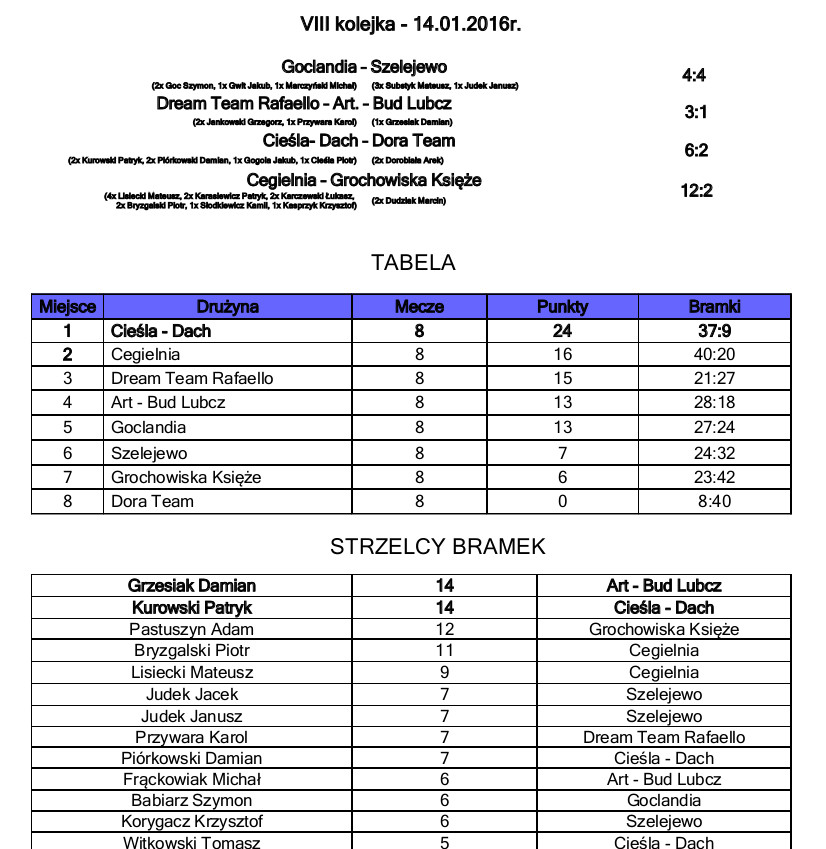 Podczas 8 kolejki Rogowskiej Ligi Halowej Piłki Nożnej w sezonie 2016/2017 padły łącznie 34 bramki, a drużyna Cieśli Dach umocniła swoją pozycję wygrywając kolejny mecz.