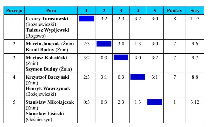 Największą ilość punktów, bo 8, zgromadził duet Cezary Turostowski / Tadeusz Wypijewski (Bożejewiczki / Rogowo). Trzy pary zdobyły po 7 punktów i o tym, kto zajmie drugie, a kto trzecie miejsce na podium zadecydowała tzw. mała tabelka. Ostatecznie drugie miejsce wywalczyli Marcin Jańczak / Kamil Budny (Żnin), a trzecie Mariusz Kolasiński / Szymon Budny (Żnin). Na czwartym miejscu uplasowali się Krzysztof Byczyński / Henryk Wawrzyniak (Żnin / Bożejewiczki), a na piątym Stanisław Mikołajczak / Stanisław Lisiecki (Żnin / Gościeszyn).