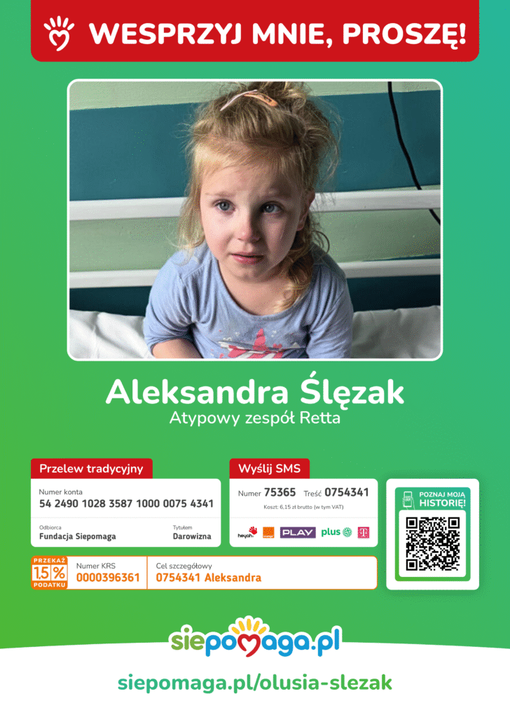 Nadzieją dla Oli jest nowoczesny lek, który spowalnia postęp choroby, dostarczając organizmowi to, czego sam nie potrafi wytworzyć. Niestety, terapia nie jest refundowana w Polsce, a jej koszt znacznie przekracza możliwości rodziny.