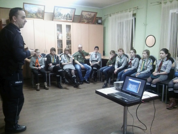 Harcerze z Wielopoziomowej Drużyny Harcerskiej im. Bohaterów Powstania Wielkopolskiego, rozmawiali z szubińskim policjantem o tym, jak bezpiecznie odpoczywać w trakcie ferii. „Mundurowy” mówił też m.in.: o bezpieczeństwie w ruchu drogowym, uzależnieniach i odpowiedzialności prawnej nieletnich.