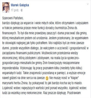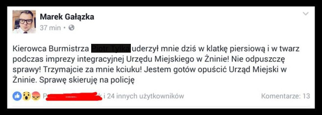 Doradca Burmistrza Żnina ds. finansowych dr Marek Gałązka zamieścił na swoim profilu Facebookowym informację, że został uderzony w klatkę piersiową, a później w twarz przez kierowcę Burmistrza Żnina, podczas imprezy integracyjnej.