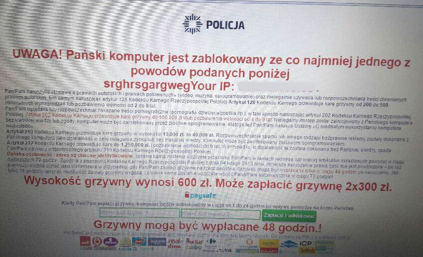 W komunikacie tym jasno było napisane, ile wynosi wysokość grzywny, tj. 600zł, która może zostać wpłacona w dwóch równych ratach, każda po 300zł. Do czasu wpłaty komputer naszego Czytelnika został zablokowany, a tylko zapłata grzywny i zaksięgowanie jej na koncie Państwa może komputer odblokować.