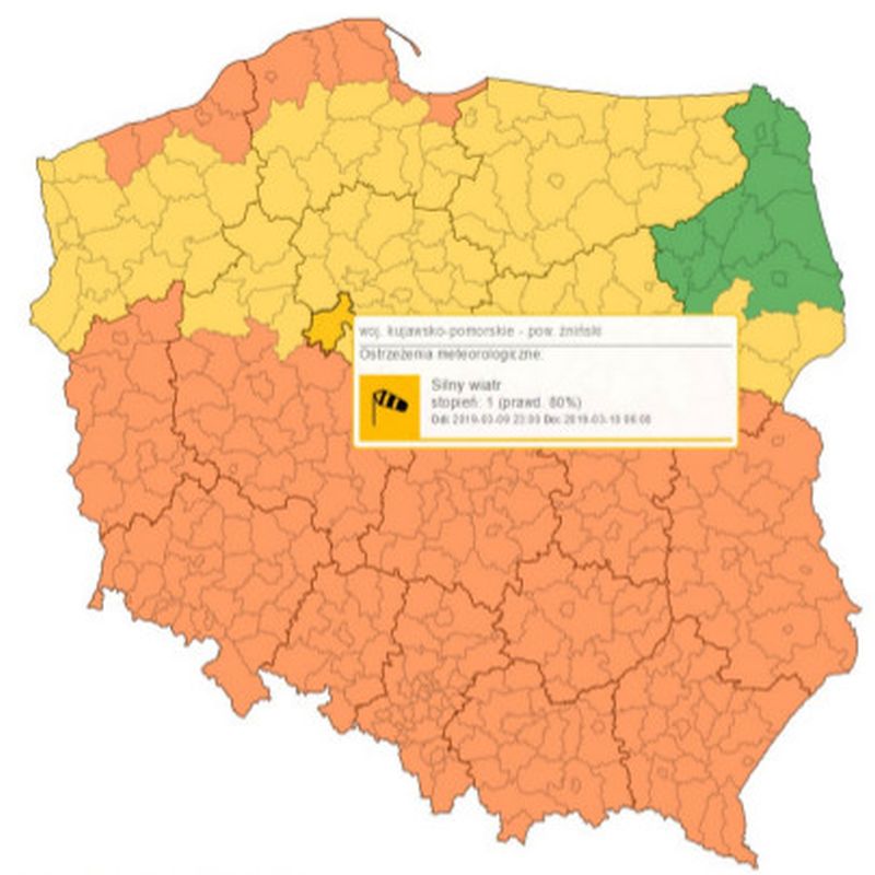Instytut Meteorologii i Gospodarki Wodnej wydał już ostrzeżenie pierwszego i drugiego stopnia przed silnym wiatrem dla 14 województw. Ostrzeżenia pierwszego (niższego stopnia) obowiązują dla województwa: zachodniopomorskiego, kujawsko-pomorskiego, warmińsko-mazurskiego, śląskiego, świętokrzyskiego i małopolskiego.