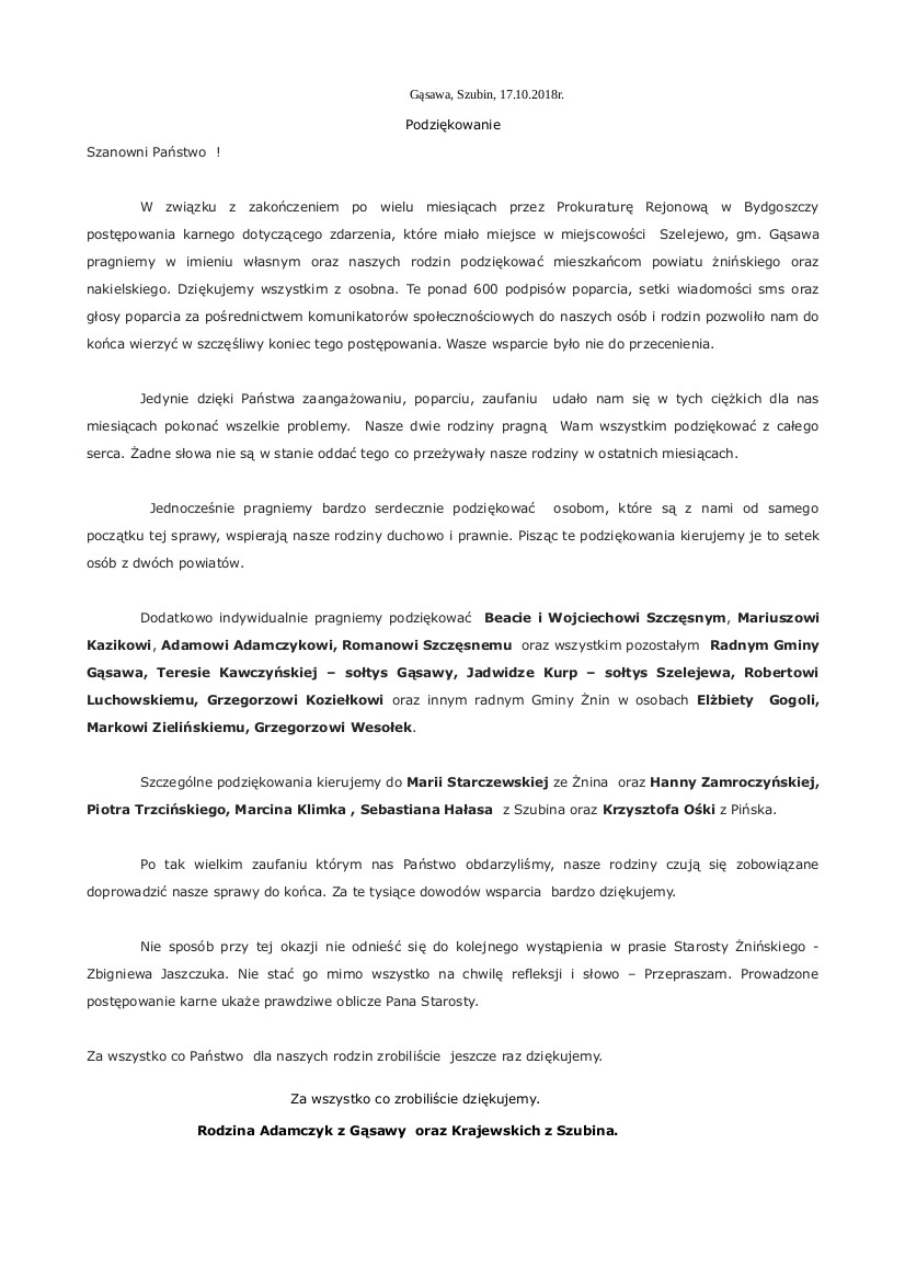 Prokuratura Rejonowa w Bydgoszczy – Południe umorzyła postępowanie w sprawie nieumyślnego spowodowania śmierci mieszkańca Szelejewa oraz niedopełnienia obowiązków służbowych i przekroczenia uprawnień przez ówczesnego Komendanta Powiatowego Policji w Żninie Artura Krajewskiego i ówczesnego komendanta komisariatu policji w Janowcu Wielkopolskim Jacka Adamczyka.