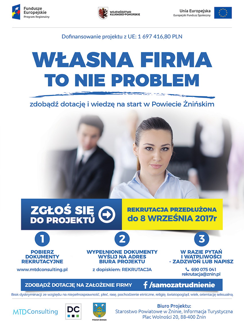 Projekt partnerski pn. „Własna firma to nie problem – zdobądź dotację i wiedzę na start w Powiecie Żnińskim” realizowany jest przez trzy instytucje: MTD Consulting Marcin Król (Partner wiodący), DC Centrum Sp. z o.o. (Partner) oraz Powiat Żniński (Partner) w ramach Regionalnego Programu Operacyjnego Województwa Kujawsko – Pomorskiego na lata 2014 – 2020, Działanie 8.3 Wsparcie przedsiębiorczości i samozatrudnienia w regionie.