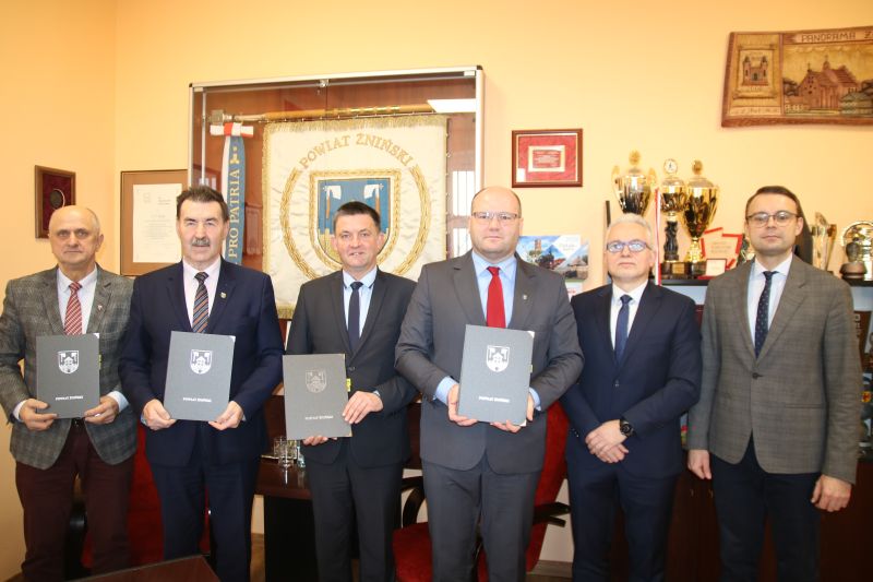 Dokument związany z wydatkowaniem środków unijnych w latach 2021-2027 podpisali: Starosta Żniński Zbigniew Jaszczuk, Wicestarosta Żniński Andrzej Hłond, Burmistrz Janowca Wlkp. Leszek Grzeczka, Wójt Gminy Gąsawa Błażej Łabędzki i Wójt Gminy Rogowo Tomasz Michalczak.