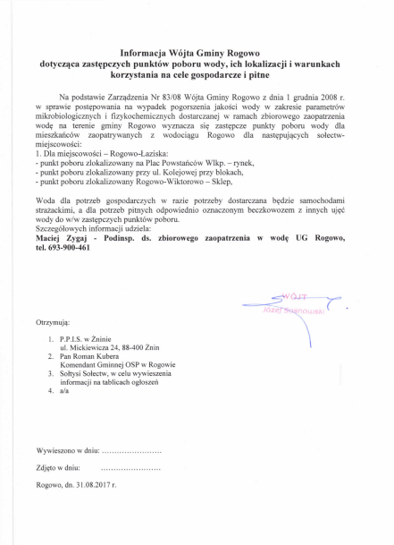 Mieszkańcy miejscowości Rogowo – Łaziska nie mogą korzystać z wody do picia, przygotowania posiłków, mycia zębów, kąpieli i brania prysznica. Woda może być używana jedynie to spłukiwania toalety. Wójt gminy Rogowo Józef Sosnowski wskazał punkty poboru wody zdatnej do picia.