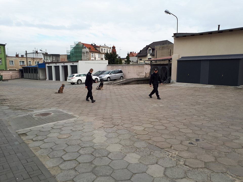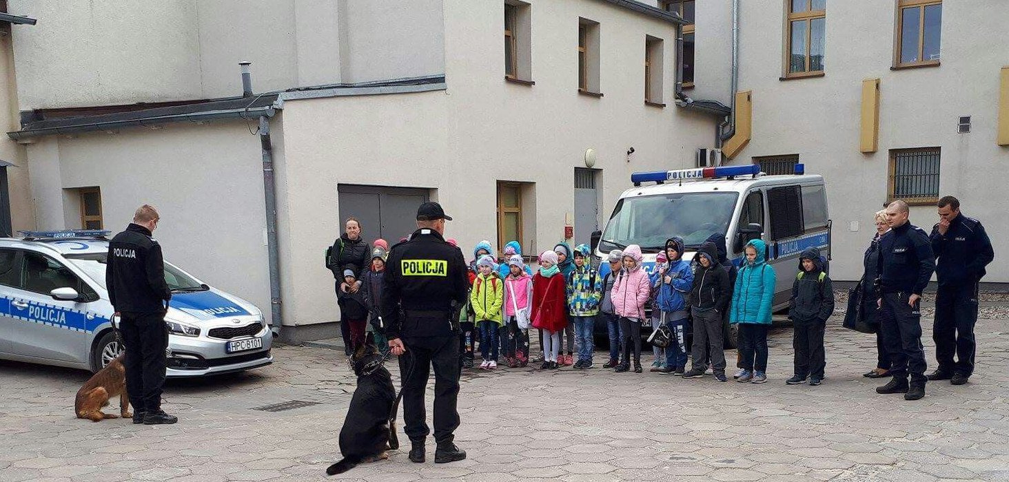 W dalszej części spotkania uczniowie udali się na dziedziniec komendy, gdzie czekali na nich przewodnicy psów służbowych: sierż. sztab. Dawid Jułga oraz st. sierż. Dariusz Śliwiński wspólnie ze swoimi podopiecznymi Ebenem i Nero. Przewodnicy opowiedzieli o pracy psów, a następnie przygotowali pokaz posłuszeństwa i pościgu za przestępcą. Pokazali również jak pies broni swojego pana przed napaścią.