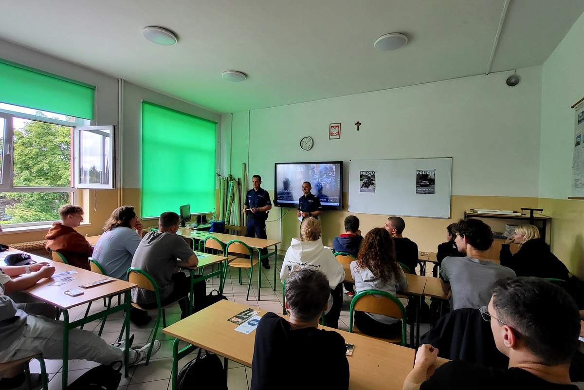 Spotkanie przebiegło w atmosferze dużego zainteresowania i aktywności ze strony uczniów, którzy chętnie zadawali pytania dotyczące zarówno służby w Policji, jak i codziennych sytuacji związanych z bezpieczeństwem. Tego rodzaju inicjatywy są doskonałą okazją do budowania świadomości młodych ludzi i zachęcania ich do odpowiedzialnych wyborów, zarówno w kwestii kariery zawodowej, jak i w życiu codziennym.