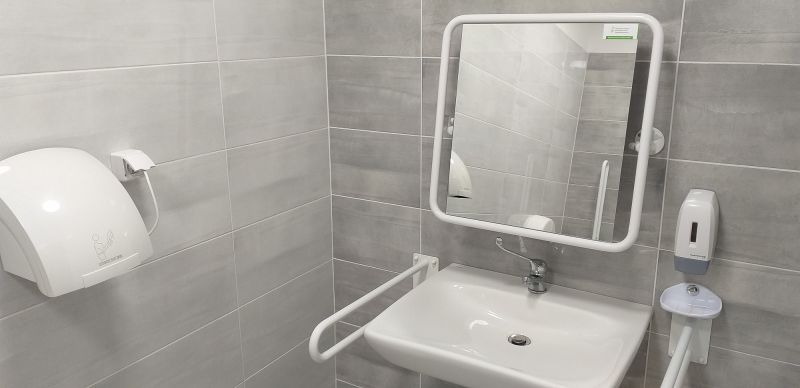 Przebudowano pomieszczenie sanitarne na pierwszej kondygnacji budynku w celu wykonania toalety dla osób niepełnosprawnych poprzez poszerzenie otworu drzwiowego, zamontowanie urządzeń sanitarnych dla osób niepełnosprawnych wraz z zabezpieczeniami oraz wykonanie prac remontowych w pomieszczeniu sanitarnym.