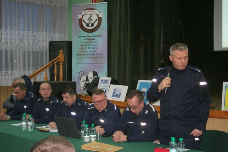 Podczas spotkania poruszone zostały cztery główne kwestie: zagrożenie przestępczością, bezpieczeństwo w ruchu drogowym, Krajowa Mapa Zagrożeń Bezpieczeństwa oraz program „Dzielnicowy bliżej nas”. Pierwsze z tych zagadnień przedstawił Komendant Komisariatu Policji w Janowcu Wielkopolskim asp. szt. Zbigniew Dudziak, który omówił jakiego rodzaju przestępstwa zaistniały na terenie gminy w minionym roku. Referent Ogniwa Ruchu Drogowego KPP Żnin sierż. szt. Marcin Marciniak scharakteryzował dane statystyczne dotyczące ilości zdarzeń drogowym na terenie gminy Rogowo. Poruszył kwestie związane z bezpiecznym poruszaniem się po drogach przez pieszych i rowerzystów, podkreślając, że bardzo duże znaczenie ma widoczność niechronionych uczestników ruchu drogowego, a co za tym idzie właściwe oświetlenie i korzystanie z elementów odblaskowych.