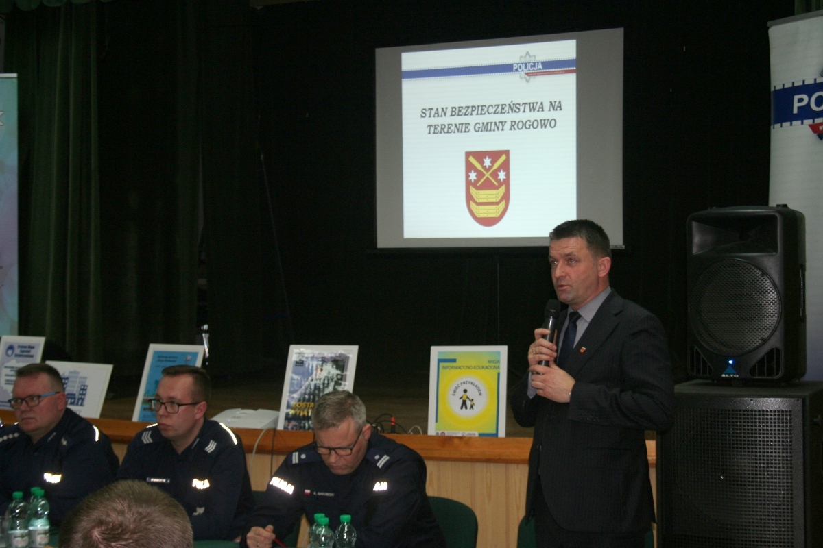 Głos zabrał także Kierownik Rewiru Dzielnicowych janowieckiego komisariatu asp. szt. Robert Wróblewski, który przedstawił założenia programu „Dzielnicowy bliżej nas”. Zaprezentował sylwetki dzielnicowych z rejonu gminy Rogowo oraz podległe im rejony służbowe. Ponadto opowiedział o aplikacji mobilnej „Moja Komenda”. Wyjaśnił, że przede wszystkim ułatwia ona kontakt z Policją, pozwala w szybki i łatwy sposób wyszukać adres dowolnej jednostki oraz zawiera dane kontaktowe wszystkich dzielnicowych. Zachęcał do korzystania z tego narzędzia oraz przedstawił krótki film obrazujący mechanizm jej działania.