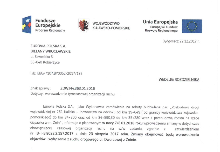 Firma Eurovia Polska w październiku br. podała drugi, kolejny termin zamknięcia ulicy Dworcowej w związku z realizacją inwestycji „Rozbudowa drogi wojewódzkiej nr 251 Kaliska – Inowrocław […] wraz z przebudową mostu na rzece Gąsawka.” Był to 26/27 listopad 2017 roku. Niestety z powodu nieścisłości w harmonogramie prac inwestycji w tym dniu nie zamknięto ul. Dworcowej.
