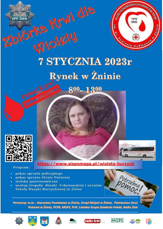W sobotę,  7 stycznia 2023 roku od godziny 8.00 do 13.00 na Rynku w Żninie przy ul. Plac Wolności, przy wsparciu Klubu Honorowych Dawców Krwi im. dr Andrzeja Hoffmanna, zostanie przeprowadzona zbiórka krwi dla naszej koleżanki Wiolety Burzych oraz innych osób, które będą potrzebować tego cennego leku.