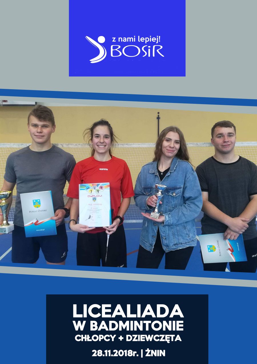 28 listopada 2018 roku w sali gimnastycznej Zespołu Szkół Ponadgimnazjalnych w Żninie rozegrany zostały Mistrzostwa Powiatu Żnińskiego w badmintonie dziewcząt i chłopów. W zawodach rywalizowali ze sobą uczniowie i uczennice szkół średnich w ramach Licealiady – roczników 1999 oraz młodszych.